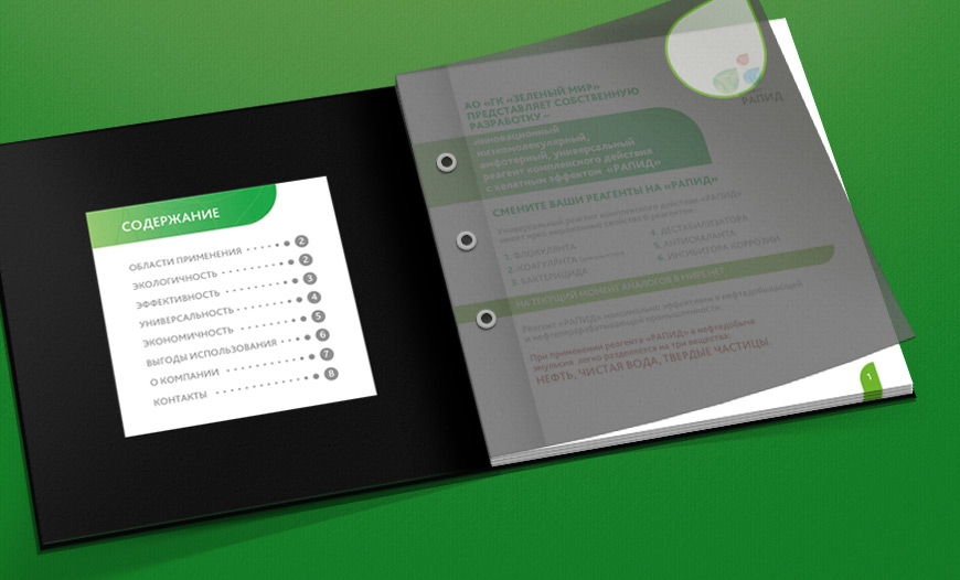 Между страницами с информацией мы поместили кальки разной степени прозрачности – от мутной до чистой, оставляя прозрачной только каплю, через которую виден логотип, напечатанный на следующей странице.