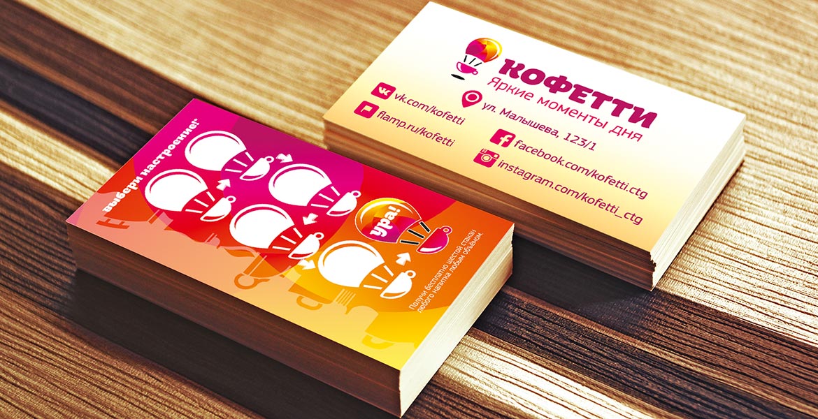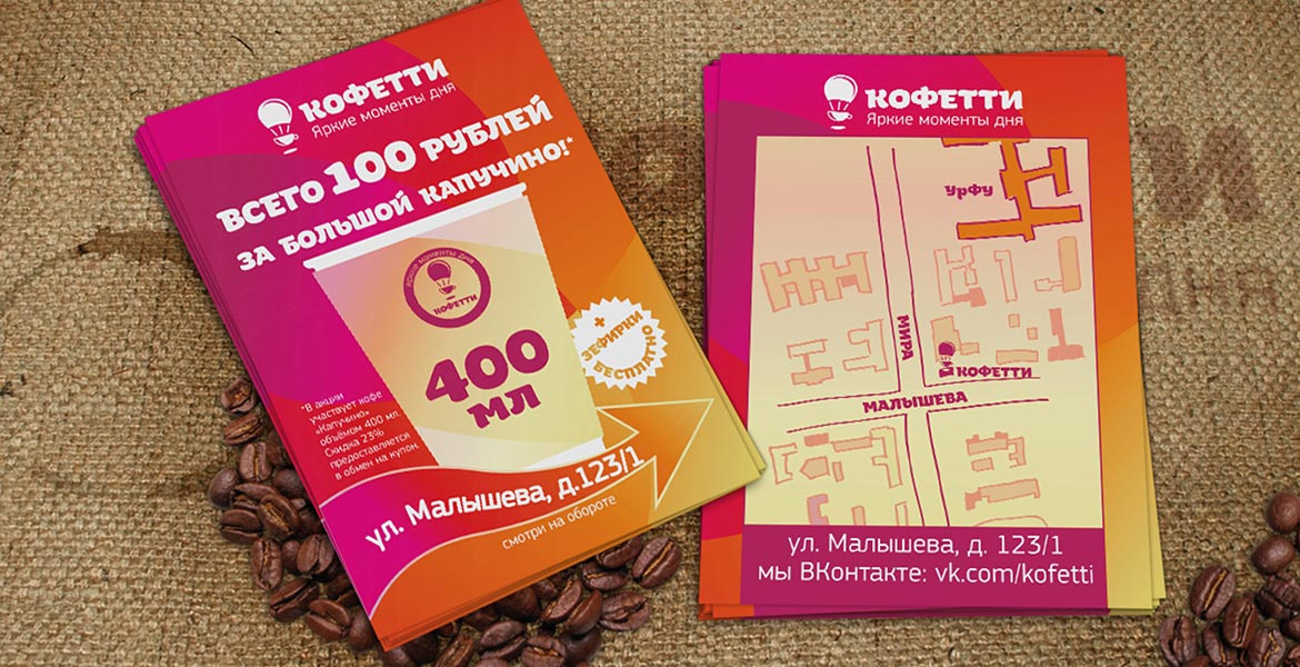 Дальше разрабатываем визитки, листовки для промо-акций, наклейки разных размеров, наружную рекламу.